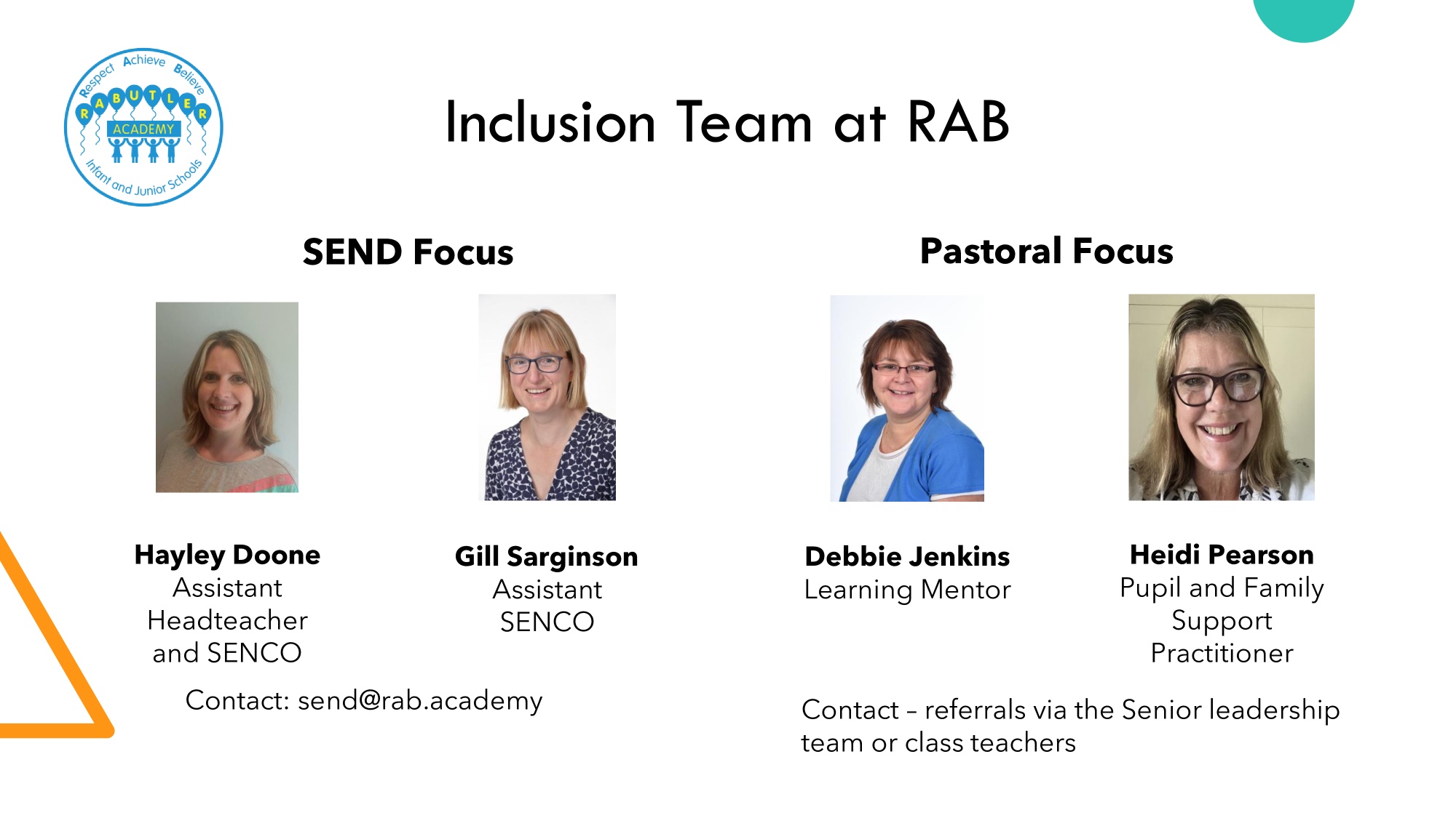 The SEND team can be contacted via send@rab.academy Anything sent to this address will be treated in confidence.